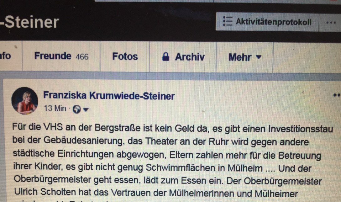 Ich habe auf Facebook einen kritischen Kommentar über den Mülheimer Oberbürgermeister gepostet. Dieser Kommentar entspricht meiner persönlichen Meinung und Haltung. Auf Facebook gibt es keine persönliche oder private Meinung. Von mir war es vorschnell, eine solche Kritik auf Facebook zu posten. Dieser Post könnte zum Anlass genommen werden, den Mülheimer Grünen eine Spaltung zu unterstellen. Da kennt man uns Grüne aber schlecht 🙂 Wir gestehen uns zu, unterschiedliche Meinungen zu haben. Das ist einer unserer Grundsätze. Als Fraktion treten wir geschlossen auf, weil wir Profis sind. Wenn ich eine Kritik am Oberbürgermeister äußere, tue ich das als Mutter, die Elternbeiträge bezahlen muss, als Mutter, die ihrem Kind in ein paar Jahren eine qualitativ hochwertige OGS-Betreuung wünscht, als Frau, die gerne in Mülheim in einem 50-Meter-Becken schwimmen würde, als Kulturinteressierte, die gerne ins Theater an der Ruhr geht, als berufstätige Mutter, die gerne gefördert werden würde und als Zugezogene, die seit 12 Jahren Mülheim an der Ruhr ihre Heimat nennt, die das Gute in der Stadt sieht und sie dennoch besser machen möchte.